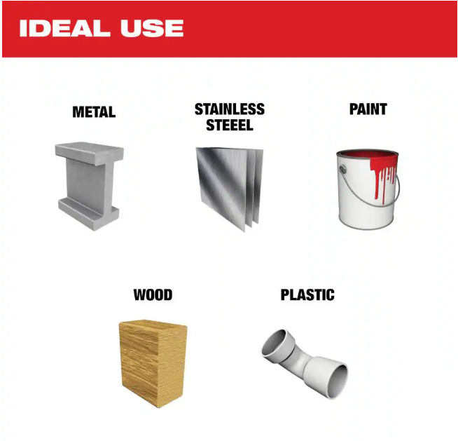 - Surface preparation for rapid grinding in metal, stainless steel, paint, wood, and plastic.