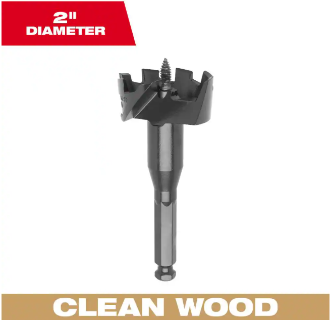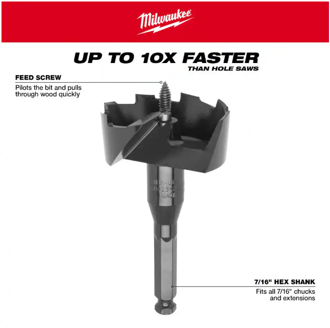 Milwaukee 2 in. Self-Feed Bit is for large hole drilling in wood. The inside cutting plane shaves the hole radius for clean, smooth holes without pressure. A removable, replaceable feed screw draws the bit into the gummiest of woods. A 7/16 in. hex shank provides a secure gripping surface for the drill chuck. The bit is coated with a rust inhibitor.