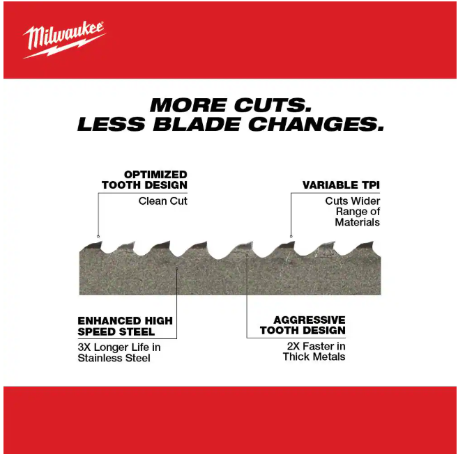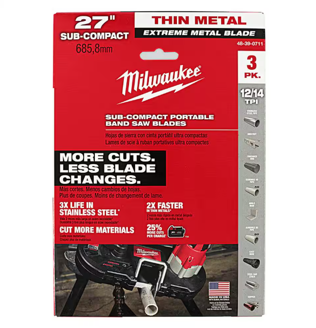 The new MILWAUKEE 27" Extreme Thin Metal 12/14 TPI Band Saw Blades deliver exactly what users need for daily job site use - More Cuts and Less Blade Changes. An aggressive variable pitched tooth design provides users with the versatility to cut more metal thickness with one band saw blade. The portable band saw blade's versatility pairs with 3X longer life in stainless steel. Each blade gives users more cuts resulting in fewer blade changes. The band saw blade also gives fast, clean cuts in common materials, giving users the performance they are looking for in a single blade. This MILWAUKEE band saw blade pack contains 3 thin metal cutting blades for portable sub compact band saws.