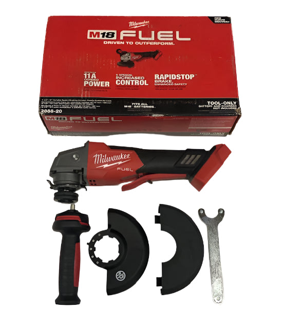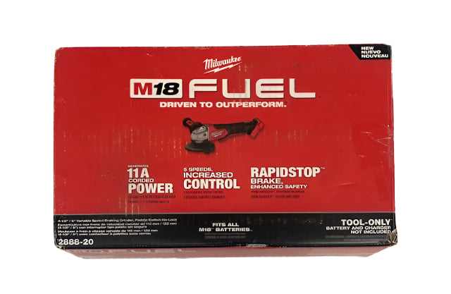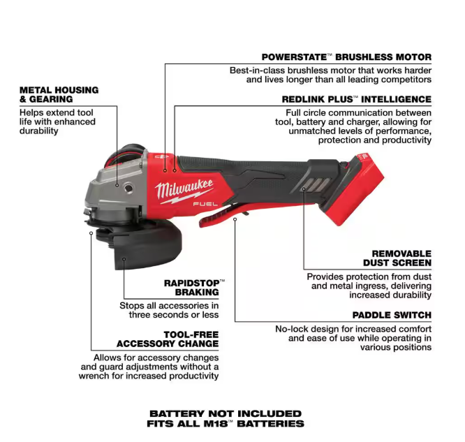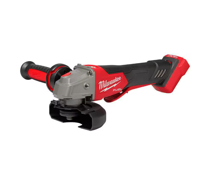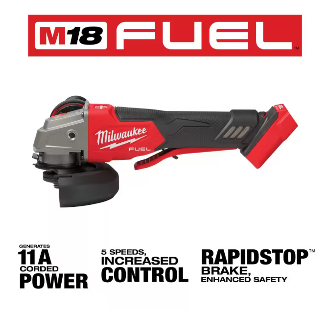 The MILWAUKEE M18 FUEL 4-1/2 in. / 5 in. Variable Speed Braking Angle Grinder, Paddle Switch No-Lock is the newest addition to Milwaukee's battery-powered grinder lineup, generating 11A Corded Power, 5 Speed for Increased Control, and RAPIDSTOP Brake for Enhanced Safety. The POWERSTATE Brushless Motor delivers 3,500- 8,500 RPM and maximum sustained power to complete the toughest grinding and cutting applications, allowing users to push their cordless angle grinders harder and longer than ever before. REDLINK PLUS Intelligence ensures unmated levels of performance, protection, and compatibility. The M18 REDLITHIUM HIGH OUTPUT XC6.0 Batteries (not included) deliver 50% more power while running 50% cooler than the M18 REDLITHIUM XC Batteries. The Variable Speed dial provides 5-speed settings between 3,500 RPM and 8,500 RPM allowing for greater control in more applications. With tool-free accessory and guard adjustments, users will experience faster accessory changes and less downtime. The M18 FUEL 4-1/2 in. / 5 in. Variable Speed Angle Grinder takes cordless tools to the next level in performance, run-time, and application versatility.
