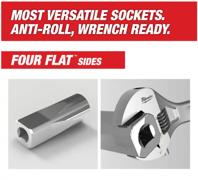 Milwaukee's 6-Point Sockets with FOUR FLAT sides feature an innovative design with 4 parallel flat sides, which deter rolling and are wrench-compatible. The socket sizes are stamped into the flats providing improved visibility. These deep well sockets have optimized geometry to reduce bolt rounding and stripping. These 10-piece sets are stored on a socket rail for tool organization and are backed with our Lifetime Guarantee.