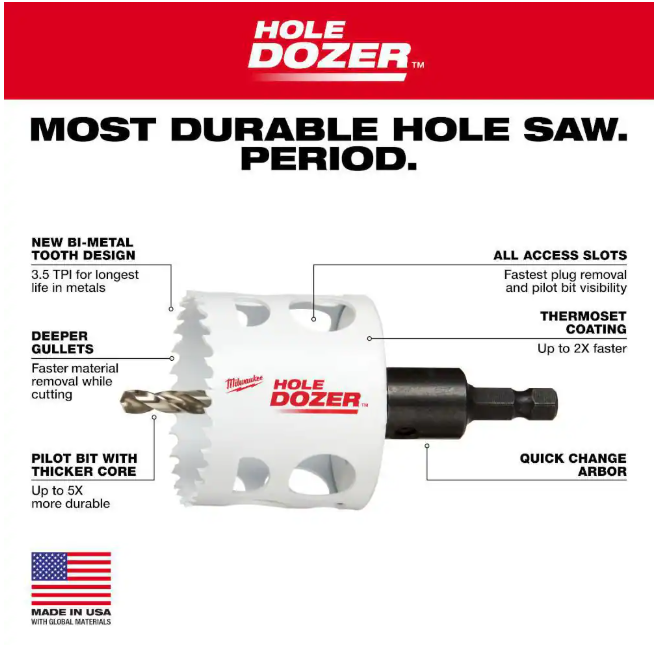 The Milwaukee Hole Dozer Hole Saw features Rip guard, the strongest tooth form in the industry, backed by the Rip guard limited lifetime tooth break warranty. Each tooth is built with more steel behind the cutting edge for added strength. The Rip Guard warranty on tooth breaks is a first for the hole saw industry. The added tooth strength along with 8% cobalt give added life to the teeth, allowing for increased productivity on the jobsite, as well as continued hole quality. The Hole Dozer includes Plug Jack, an all access slot design that allows for full access during plug removal. The Plug Jack gives access lower into the cup for thick material and higher towards the teeth for thin material. With multiple positions to apply leverage and better plug access, Plug Jack increases productivity and eliminates wasted downtime between holes. For fast, tool-free change-outs, use Milwaukee's universal Quick-Change Arbors. 49-56-7210, 49-56-7240, 49-56-7250 and 49-56-9100.