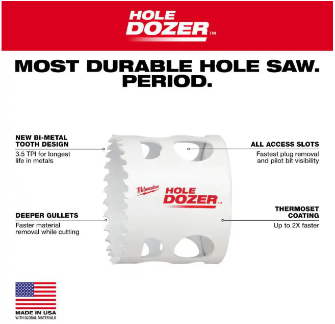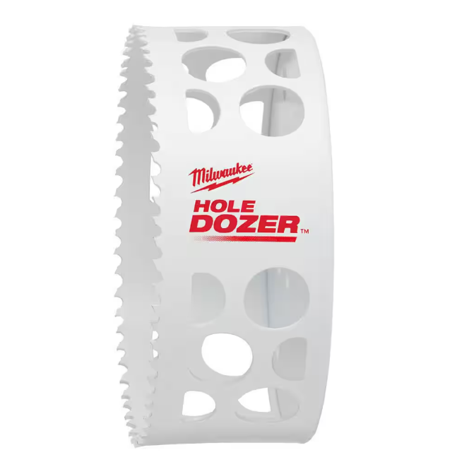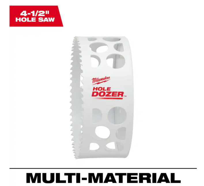 The Milwaukee 4-1/2 in. Hole Dozer Hole Saw features Rip Guard teeth that were built with more steel behind the cutting edge for added strength. They give you enhanced productivity on the job site as well as better hole quality. They're also backed by a limited lifetime tooth break warranty. The Hole Dozer comes with a Plug Jack, an all-access slot design that allows for full access during plug removal. The Plug Jack enables access lower into the cup for thick material and higher toward the teeth for thin material. With multiple positions to apply leverage and better plug access, the Plug Jack eliminates wasted downtime between holes. Pair this hole saw kit with universal quick-change arbors for fast, tool-free change-outs (model numbers 49-56-7210, 49-56-7240, 49-56-7250 and 49-56-9100 - sold separately).