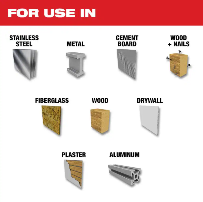 - Cuts stainless steel, fastener embedded wood, cement board, fiberglass, plaster, asphalt shingles and more