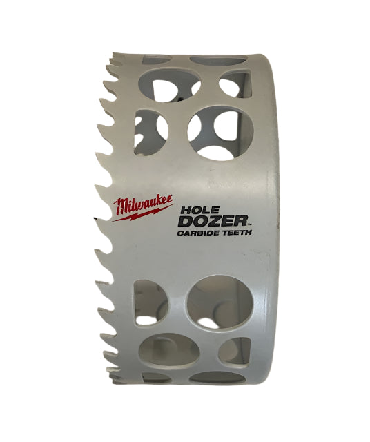 The MILWAUKEE 4-1/4" HOLE DOZER with Carbide Teeth Hole Saw features a new 3 TPI design that offers users fast cuts with the durability of a bi-metal hole saw and life of a carbide hole saw. This Milwaukee hole saw provides the longest life in general purpose and extreme materials with the ability to cut through stainless steel, cast iron, fastener embedded wood, cement board, fiberglass, plaster, asphalt shingles, and more with ease. Deep gullets clear material fast while cutting, and Milwaukee's ALL-ACCESS SLOTS solve the frustration of plug removal, making users more productive with less downtime between holes. The new slot design also gives users increased pilot visibility for accurate placement and faster chip ejection keeping their cut cool. The HOLE DOZER with Carbide Teeth Hole Saw has a cutting depth of 1.62 in., allowing clearance to handle cuts in a wide range of materials. Milwaukee HOLE DOZER with Carbide Teeth Hole Saws are proudly made in the USA.