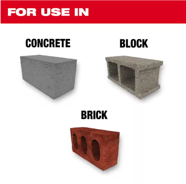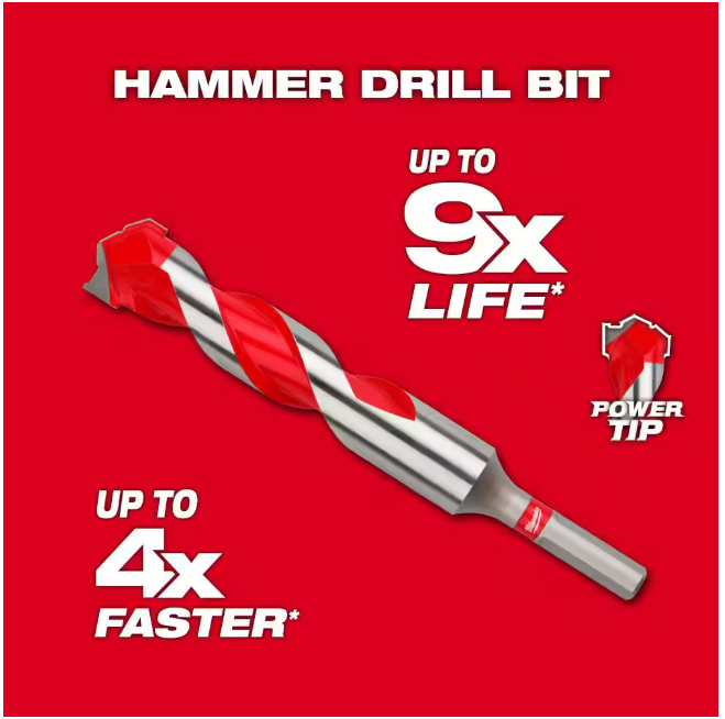 The MILWAUKEE® Carbide Hammer Drill Bits are designed with sharpened carbide to deliver up to 9x longer life and 4x faster drilling into concrete. The POWER TIP™, available in sizes 3/8" and above, is designed with dynamic cutting edges and a chip breaker for increased productivity and easier drilling from start to finish. Engineered with precision ground carbide, these bits deliver faster starts and less walking in concrete, brick, and block. Wide flute design removes dust faster, reducing heat and delivering more holes per charge. Equipped with a 3-Flat Secure Grip™ shank, Milwaukee® Carbide Hammer Drill Bits are the ideal solution for drilling in masonry materials with hammer drills/drivers. Available in diameters up to 1 inch.