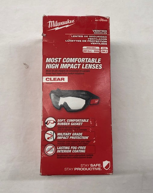 The MILWAUKEE Vented Goggles give you the Most Comfortable wear, with a soft rubber gasket that evenly distributes pressure across the face. They are designed to fit over most prescription glasses and provide a wide field of view. For added protection, the lenses are high-velocity impact tested with the ability to withstand projectile shots at 725 ft/sec, providing you with military-grade impact protection, based on the MCEP ballistic fragmentation protection for class 1 devices. This protective eyewear features an anti-scratch hard exterior coating and a fog-free interior coating, keeping the lenses clear and unobstructed to withstand the demands of the jobsite. These goggles are D3 and D4 rated to provide additional protection against splash/droplets and dust. The soft, easily adjustable strap fits a wide range of head shapes and sizes and helps secure the goggles to your face, ensuring a complete seal. Clear and tinted lens color options are available, so your eyes stay safe whether working indoors or outdoors.