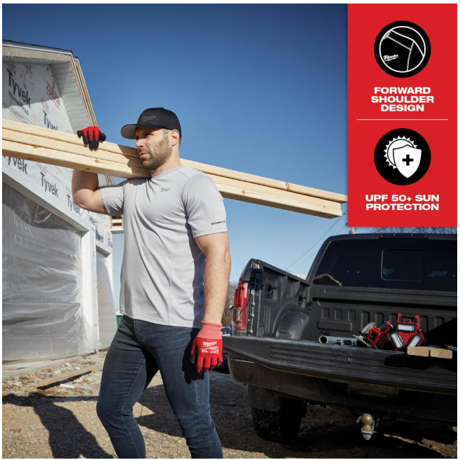 The MILWAUKEE Short Sleeve Gray WORKSKIN Lightweight Performance Shirt is designed for tradesmen who need their next-to-skin layer to dry fast, keep them cool, and protect them from harmful UV rays. Get a work shirt that withstands the demands of the toughest job sites with a Milwaukee WORKSKIN made from moisture-wicking fabric that helps users stay dry while working. The 100% polyester material dries fast and resists wrinkles, unlike standard cotton base layers. The relaxed fit and raglan sleeves that allow users to move freely to accomplish any task for comfortable all day wear.