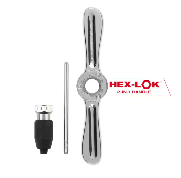The MILWAUKEE ® Hex-LOK™ 2-in-1 Handle and Tap Collet is the most versatile threading solution for Tap and Die threading. The Hex-LOK™ 2-in-1 Handle combines the benefit of both internal and external threading within one handle by its compatibility with both 1” hex dies and the MILWAUKEE® Tap Collet. The handle’s ergonomic grip is designed to deliver ultimate user comfort while cutting threads. The all-metal construction allows for the tool-free die and tap collet changes and is optimized for maximum balance and control when threading. The MILWAUKEE® Tap Collet is designed for versatile tap threading and holds the widest tap range, used for all tap sizes up to 1/2”. With a durable all-metal dual jaw design, the MILWAUKEE® Tap Collet tightly secures taps for smooth, no wobble threading. The forward jaw holds taps 1/4”-1/2” while the recessed jaw secures taps up to 1/4”. The sliding T-Handle bar allows for use in tight or hard-to-reach spaces. The MILWAUKEE® Hex-LOK™ 2-in-1 Handle and Tap Collet are designed for use in the most common metal applications including brass, aluminum, mild steel, and more. Handle covered under a limited lifetime warranty.