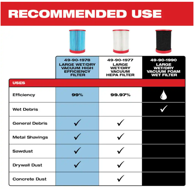 - Includes (1) Large Wet/Dry Vacuum HEPA Filter