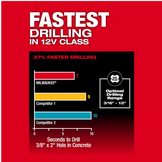 The MILWAUKEE M12 FUEL 5/8" SDS Plus Rotary Hammer Kit delivers unmatched performance within a compact solution. This hammer is the Fastest Drilling in its 12V Class, has a Lightweight One-Handed Design, and can complete Up to (73) ¼" x 2" Holes Per Charge when paired with the M12 REDLITHIUM XC4.0 Battery. The POWERSTATE Brushless Motor delivers .89 ft-lbs of impact energy, 1,200 RPM, and 4,400 BPM, enhancing portable productivity. REDLINK PLUS Intelligence ensures maximum rotary hammer performance and protects it from overload, overheating, and over-discharge. Optimized for tight spaces and overhead use, this compact rotary hammer reduces fatigue for all-day productivity. Equipped with shadowless lighting for increased visibility and an integrated hang hook for functional storage and convenience, this hammer takes portable productivity to the next level. For maximum versatility, this hammer features a 3-mode operation - hammer drill, drill-only, and chisel for light material removal. Additionally, the hammer is equipped with an AVS Anti-Vibration System, minimizing vibration for maximum comfort. This kit includes an M12 REDLITHIUM XC4.0 Battery Pack, M12 Multi-Voltage Charger, and carrying case.
