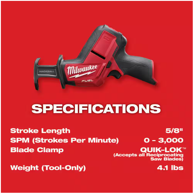 The Milwaukee M12 FUEL HACKZALL Reciprocating Saw Kit (2520-20) delivers impressive run time, fast cutting and extensive tool life. A compact, 1-handed design provides superior control and the ability to make cuts in tight spaces, with lightweight construction that is optimal for overhead cutting applications. The POWERSTATE Brushless Motor offers constant power output, yet runs cool with no wearable components. REDLINK PLUS Intelligence ensures optimized performance and protects your investment from overload, overheating and over-discharge, while the M12 REDLITHIUM XC4.0 battery pack offers exceptional work per charge and work over the life of the pack for reliable, long-term performance.