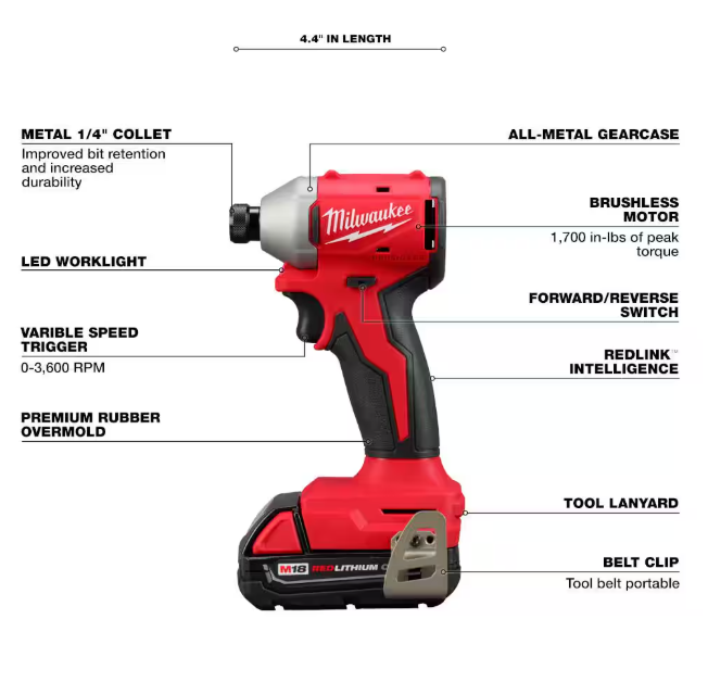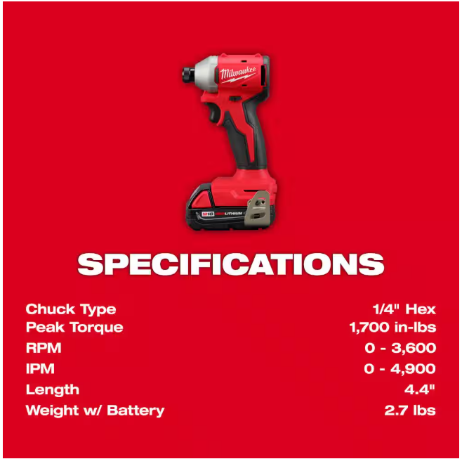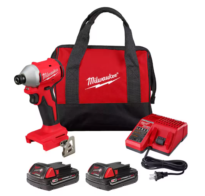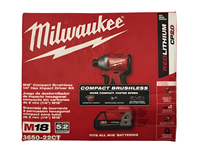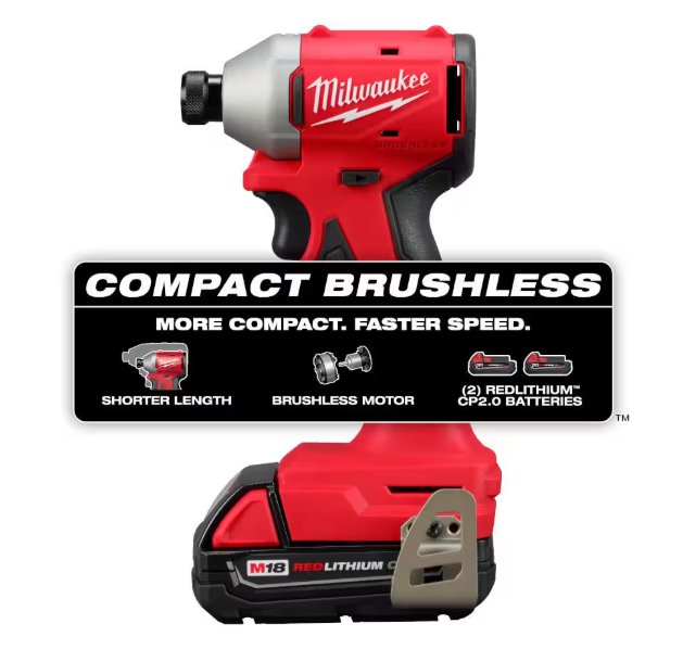 - Includes: M18 Compact Brushless 1/4" Hex Impact Driver (3650-20), (2) M18™ REDLITHIUM™ CP2.0 Battery Pack (48-11-1820), M18/M12 Multi-Volt Charger (48-59-1812), Contractor Bag
