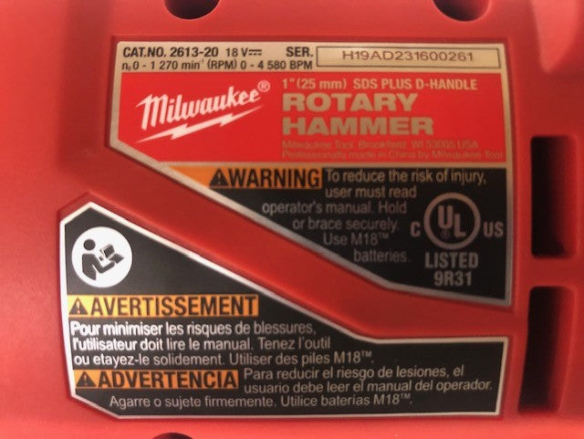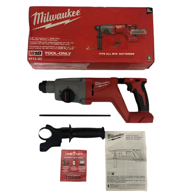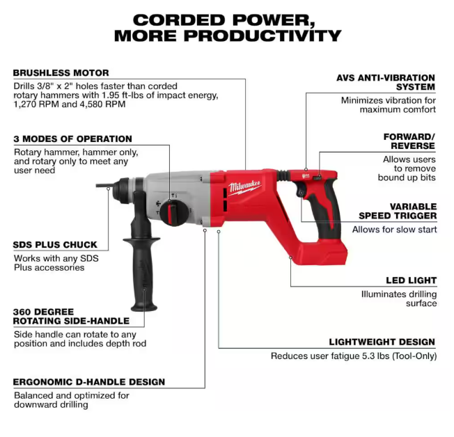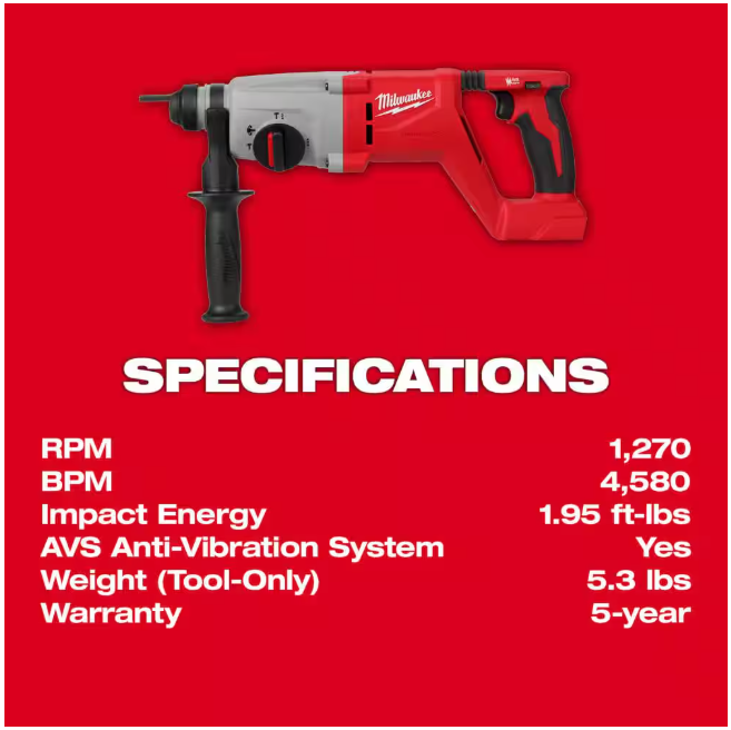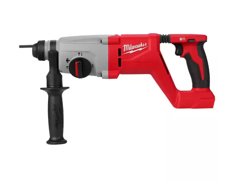 The MILWAUKEE M18 Brushless 1" SDS Plus D-Handle Rotary Hammer delivers Corded Power & More Productivity without the hassle of cords. The Milwaukee cordless rotary hammer drills 3/8" x 2" holes faster than corded D-Handle rotary hammers. The Brushless motor delivers 1.95 ft-lbs of impact energy, 1,270 RPM, and 4,580 BPM. The in-line D-Handle design allows access in tight spaces and provides superior balance and ergonomics for downward drilling. Milwaukee AVS Anti-Vibration System minimizes vibration for maximum comfort. The lightweight design of this tool reduces user fatigue throughout the work day at 6.9 lbs when paired with the Milwaukee M18 REDLITHIUM XC5.0 Battery (not included). The Milwaukee M18 Brushless 1" SDS Plus D-Handle Rotary Hammer drills up to (100) 3/8"x 2" holes per charge when paired with the M18 REDLITHIUM XC5.0 battery (not included). For onboard OSHA Table 1 Compliance, pair with the MILWAUKEE M12 HAMMERVAC Universal Dust Extractor (2509-22). This Milwaukee cordless D-Handle rotary hammer is a part of the M18 System, which is fully compatible with over 250 solutions.