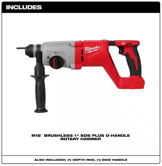 - Includes: (1) Rotary Hammer, (1) Side Handle, (1) Depth gauge