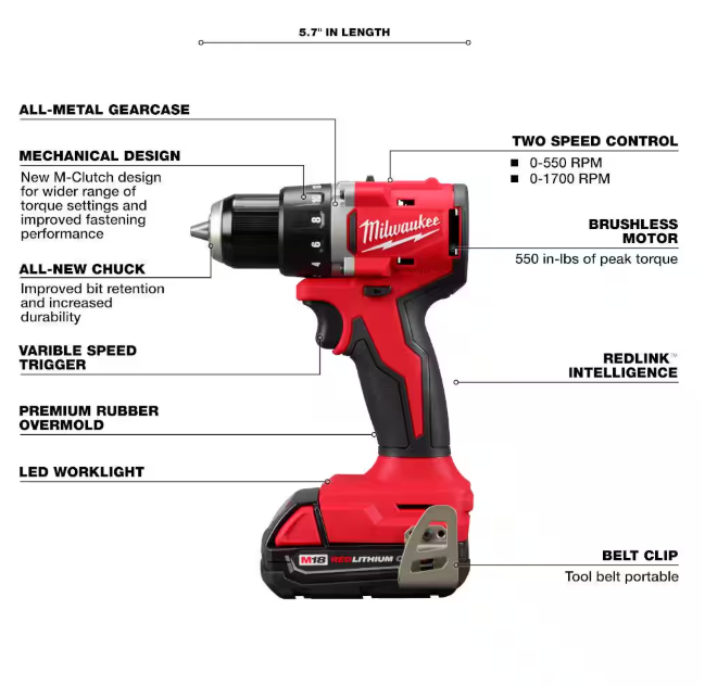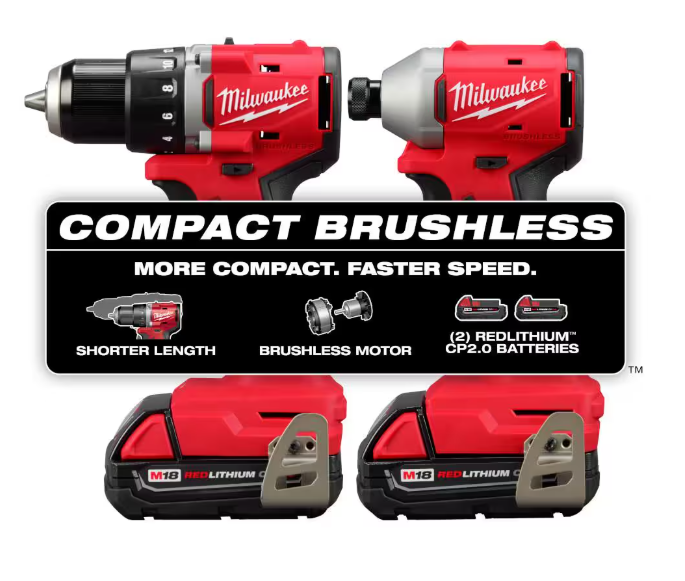 The MILWAUKEE M18 Compact Brushless 2-Tool Combo Kit is more compact with faster speeds in the application. Includes the M18 Compact Brushless ½" Drill Driver, M18 Compact Brushless ¼" Hex Impact Driver, (2) M18 REDLITHIUM CP2.0 Battery Packs, M18/M12 Multi-volt Charger and Contractor Bag. The compact drill is 5.7" in length and lightweight at 2.3 lbs without a battery allowing for excellent control, especially while working in overhead or tight spaces. The brushless motor was built to ensure optimal tool performance delivering 550 in-lbs of torque and 0-1,700 RPM, able to tackle a wide range of drilling and fastening applications. The impact driver measures only 4.4" in length and 2.1" in width, allowing for better access in tight spaces while being lightweight and portable. The brushless motor technology provides 1,700 in-lbs of torque and 3600 RPMs for faster speed and increased productivity. MILWAUKEE REDLINK Intelligence optimizes the way the M18 REDLITHIUM batteries work with the tools for best-in-class performance. These cordless tools have premium components, including an all-metal gear case and ½" metal chuck providing the durability that professionals require. The M18 Compact Brushless 2-Tool Combo Kit is part of the M18 system, fully compatible with over 250+ solutions.
