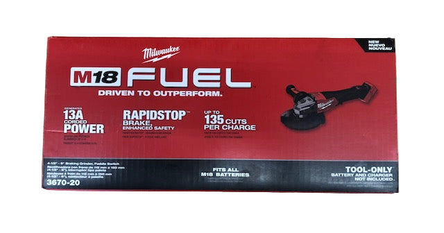 The MILWAUKEE M18 FUEL 4-1/2" / 6" Braking Grinder Paddle Switch, No Lock is the next advancement in power and performance, generating 13A corded power, fastest cutting, and delivering up to 135 cuts per charge. The M18 FUEL 4-1/2" / 6" Braking Grinder generates 13A corded power allowing you to complete the toughest grinding and cutting applications, all on the M18 Cordless System. The POWERSTATE Brushless Motor delivers maximum sustained power and 9,000 RPM to remove material faster and increase productivity. REDLINK PLUS Intelligence ensures unmatched levels of performance, protection, and compatibility. The RAPIDSTOP Brake provides stop times under 2 seconds with an abrasive disc. The M18 FUEL 4-1/2" / 6" Braking Grinder includes an electronic clutch for kickback protection, as well as overload protection to maximize motor life. Pair with the M18 REDLITHIUM FORGE XC8.0 Battery Pack for HIGH OUTPUT HD12.0 power in a smaller size, and longest life vs. REDLITHIUM batteries. The M18 FUEL 4-1/2" / 6" Braking Grinder takes cordless grinders to the next level in performance and run-time.