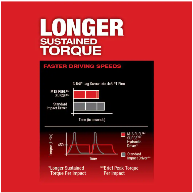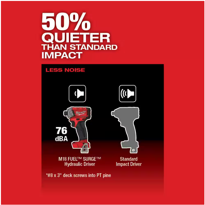 The M18 FUEL SURGE 1/4 in. Hex Hydraulic Driver is the quietest cordless fastening solution on the market. With Milwaukee's new FLUID-DRIVE Hydraulic Powertrain, users will experience up to 50% quieter operation, 3X less vibration for smoother operation and faster driving speeds compared to standard impacts. The POWERSTATE Brushless Motor delivers up to 0-3,000 RPM with constant power output to drive screws faster. REDLINK PLUS Intelligence is the most advanced Electronic system on the market, preventing damage to the tool and battery caused by overloading or overheating. For use with REDLITHIUM Compact Batteries or Extended Capacity Batteries (sold separately), which deliver more work per charge and more work over the life of the pack than competitive batteries on the market. The 4-Mode DRIVE CONTROL provides greater control over output speed and power for greater versatility. Self-Tapping Screw Mode is designed to reduce walking when starting self-tapping screws as well as reduce overdriving, breaking and stripping out screws.