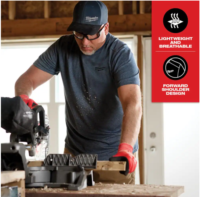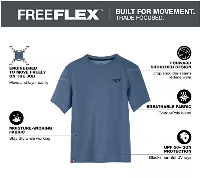 The Milwaukee Large Blue Short Sleeve Hybrid Work Tee is a lightweight and breathable solution that allows users to STAY COMFORTABLE and KEEP COOL. This short sleeve t-shirt is specifically created for mobility and durability with its drop shoulder design to reduce wear on the seams. The Hybrid Work Tee Shirt is built to protect against the elements, offering UPF 50 protection for those warm days on the job site and moisture-wicking fabric so users can stay dry while working.