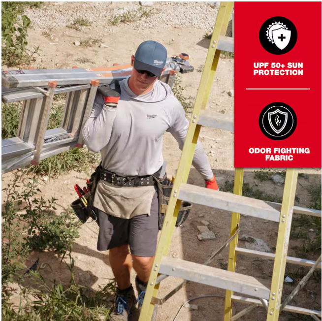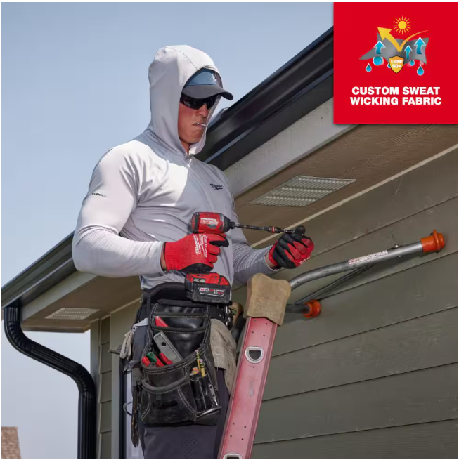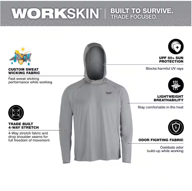 Part of the MILWAUKEE WORKSKIN Collection, the Hooded Sun Shirt is BUILT TO FIGHT SWEAT. Engineered with a custom sweat wicking fabric, the WORKSKIN Hooded Sun Shirt is designed to keep you dry and comfortable. Complete with UPF 50+ sun protection and odor fighting technology, this Sun Shirt is perfect for hot summer days on the job. Milwaukee WORKSKIN products are developed in collaborating with feedback from users across the trades through continuous jobsite research.