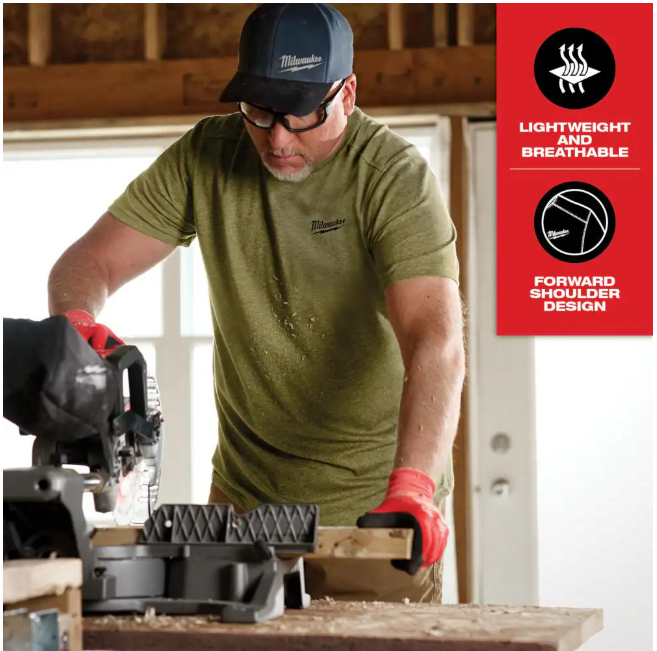 The MILWAUKEE XL Green Short Sleeve Hybrid Work Tee is a lightweight and breathable solution that allows users to STAY COMFORTABLE and KEEP COOL. This short sleeve t-shirt is specifically created for mobility and durability with its drop shoulder design to reduce wear on the seams. The Hybrid Work Tee Shirt is built to protect against the elements, offering UPF 50 protection for those warm days on the job site and moisture-wicking fabric so users can stay dry while working.