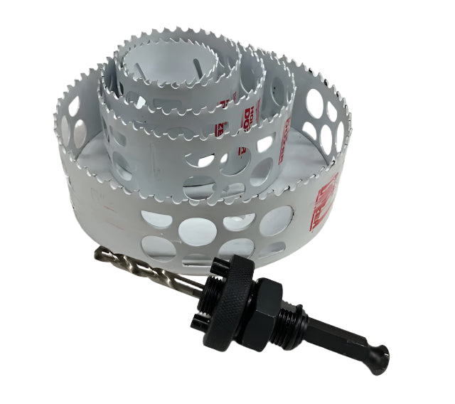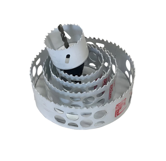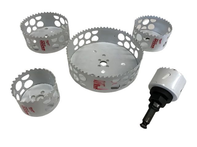 The Milwaukee 6 in., 4 1/4in., 3 1/2in., 2 3/4 in and 2 1/8 in. Hole Dozer Hole Saws feature Rip Guard teeth that were built with more steel behind the cutting edge for added strength. They give you increased productivity on the job site as well as better hole quality. The Hole Dozers comes with a Plug Jack, an all-access slot design that allows for full access during plug removal. The Plug Jack enables access lower into the cup for thick material and higher towards the teeth for thin material. With multiple positions to apply leverage and better plug access, the Plug Jack eliminates wasted downtime between holes. This hole saw kit is paired with a universal quick-change arbor for fast, tool-free change-outs. The 6in. saw has been used once and the other 4 are brand New.