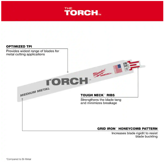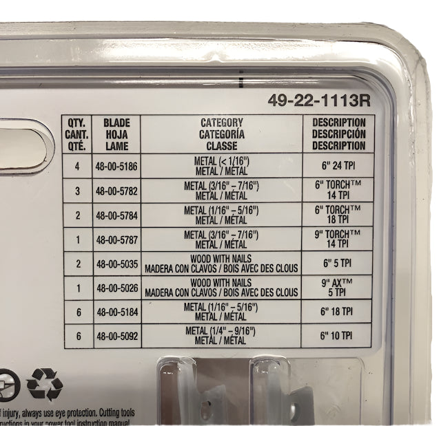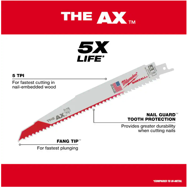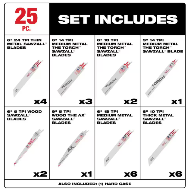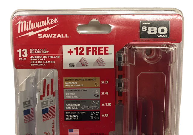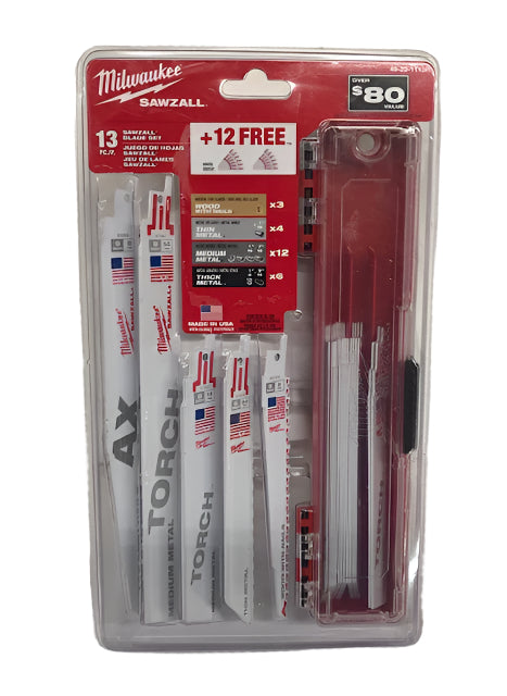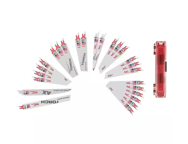 Our 13-Piece Bi-Metal SAWZALL Reciprocating Saw Blade Set + 12 free Bi-Metal blades is designed for a broad range of professional applications, including general use and demolition. The AX wood cutting saw blades are equipped with Fang Tip and Nail Guard technology to extend blade life and increase durability in nail-embedded wood. The Torch demolition metal cutting blades provide 5X blade life and facilitate tough cuts. They also feature Grid Iron technology for increased blade stiffness. The metal cutting blades feature TOUGH NECK ribs that strengthen the blade tang and minimize breakage. This MILWAUKEE SAWZALL blade set also includes a jobsite case for convenient saw blade storage.