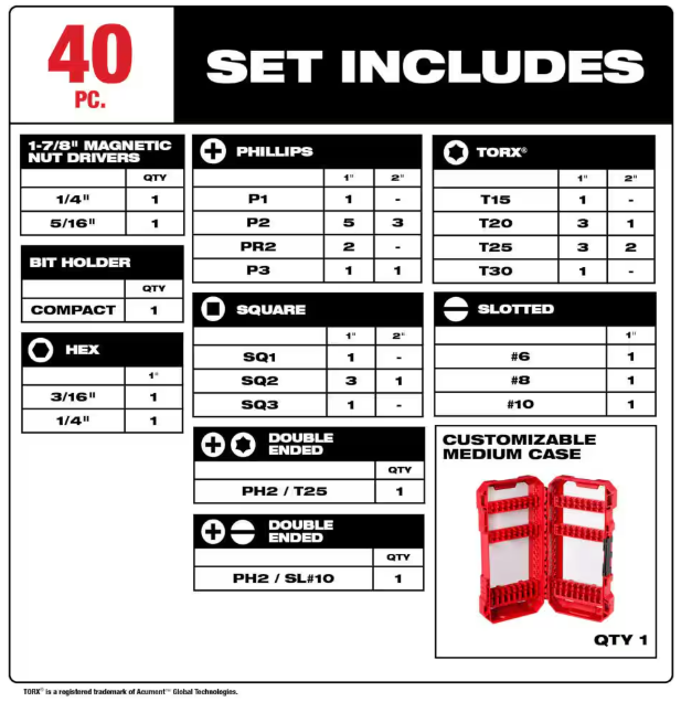 The MILWAUKEE SHOCKWAVE Impact Duty 40PC Driver Bit Set is engineered to be the Most Durable, Best Fitting driver bits on the market. The WEAR GUARD TIP delivers increased wear resistance which protects the impact bit's fit over the life of the bit. The SHOCK ZONE is optimized for each tip type and length of driver bit in the set to absorb peak torque and prevent breaking. The driver bits are made from CUSTOM ALLOY76 steel and a proprietary heat treatment process to extend bit life, providing up to 50X life versus other impact driver bits on the market. The Milwaukee SHOCKWAVE Impact Duty driver bits are built to provide users with extreme durability for the most demanding applications. The set is organized in a customizable accessory case designed for use in PACKOUT.