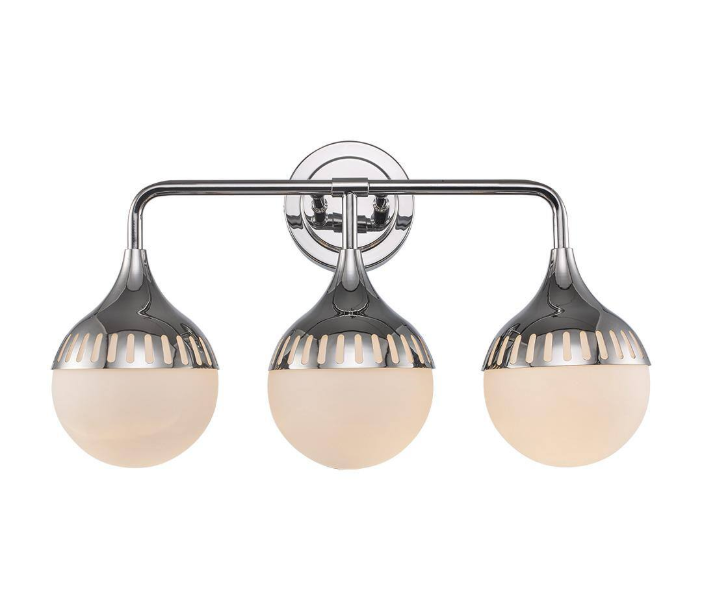 This Monteaux Lighting 3-light vanity fixture is designed to add a classic feel to bathroom and powder room areas while appealing to midcentury modern and industrial decor styles. This vanity light is finished in chrome and includes opal glass round shades that look great on or off. Each shade is adorned on top a with a metal detailed arm that attach firmly to the matching round wall plate. The three light design is ideal for use over medium sized vanities.