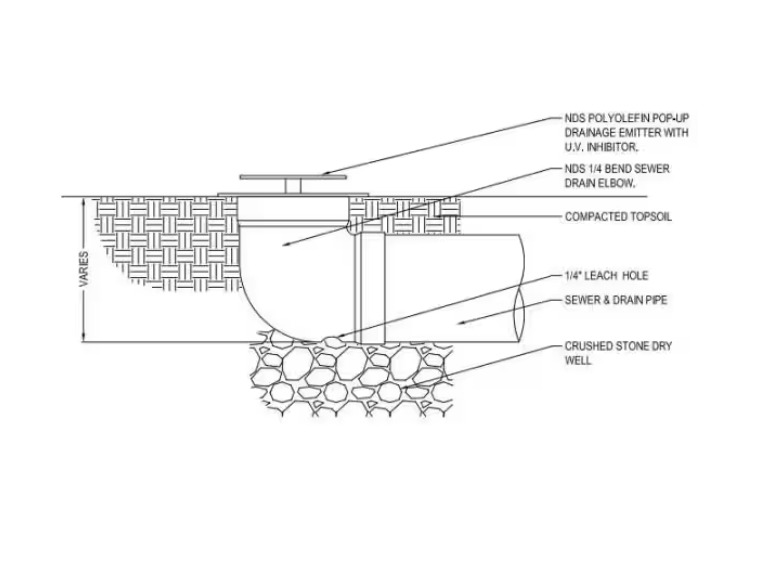 Use the Pop-Up Drainage Emitter downstream to discharge water captured upstream and carried away from structures, erosion-prone landscapes and poor drainage areas. The Pop-Up Drainage Emitter with Elbow connects to 4 in. sewer and drain pipe and 4 in. triple-wall pipe. As water pressure builds, cap "pops up" to release water at up to 56 GPM and closes when flow diminishes. Cap stays closed when not in use to prevent debris and rodents from entering and potentially clogging the drainage system. The flat profile blends discreetly into the surrounding landscape. Rounded contours on interior edges reduce the potential for clogging and internal ribs provide durability and strength. Flange design prevents turf overgrowth. Weep hole at bottom of elbow drains water left in pipes to prevent stagnation or freezing in cold weather. Cap and cover made of high-density polyethylene (HDPE), elbow made of polyvinyl chloride (PVC). Pop-Up Drainage Emitters are part of a complete drainage system used for stormwater management. They work with pipes, catch basin drains, channel drains, trench drains and drain grates that filter, capture and convey excess water to drain pipes, the pipes carry the water downstream to discharge with a Pop-Up Emitter or to percolate into the ground with a dry well or infiltration trench. NDS offers free tools such as the Home Drainage Center, Calculators and NDS Stormwater Drainage mobile app to help make your project a success.