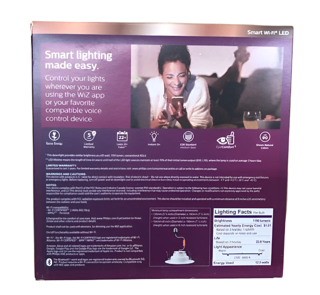 Philips Smart Wi-Fi LED lighting puts you in complete control of your lighting with smart bulbs that are easy to use, functional, and affordable. We've made all of your favorite high-quality Philips bulbs smarter, just connect them to your existing Wi-Fi network. This Smart Color and Tunable White 6" downlight lets you live life colorfully. Dynamic light modes make any room glow in your favorite color. Or use tunable white light that adjusts from warm white to cool daylight. Use app presets to choose lighting for each of your daily activities. You can play with millions of colors, thousands of shades of white, and enjoy pre-set well-being modes to find the ideal light temperature. Control your lights wherever you are using the WiZ app or your favorite compatible voice control device. This recessed downlight is easy to install in any 6" E26 medium base recessed can. This product requires a Wi-Fi connection to operate wirelessly. Philips Wi-Fi lighting is WiZ-connected and controlled with the WiZ app. Not compatible with Philips Hue.