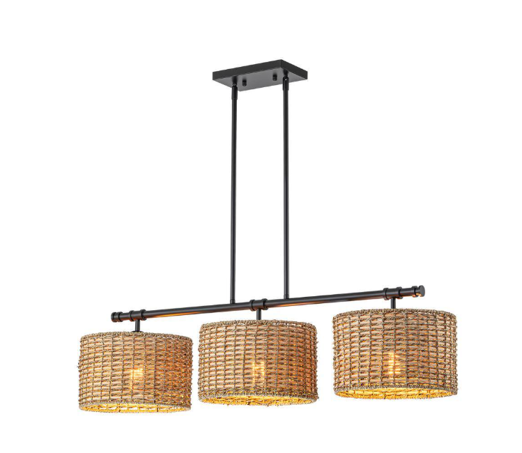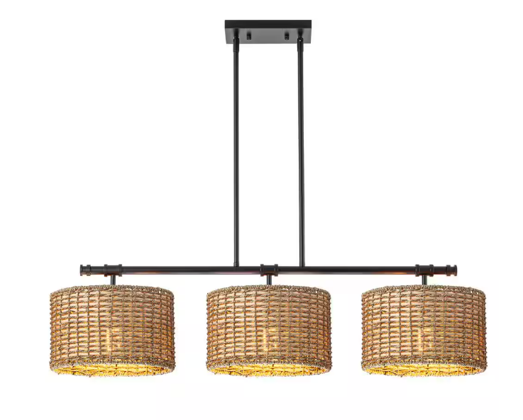 Rennnsan Terry 3-Light Black Farmhouse Linear Island Chandelier Light with Rattan Shades