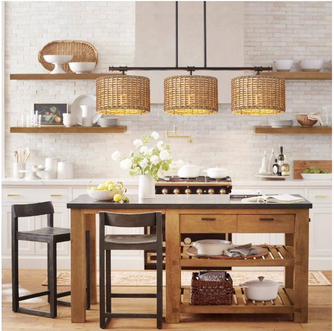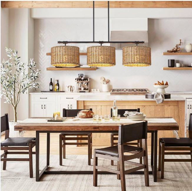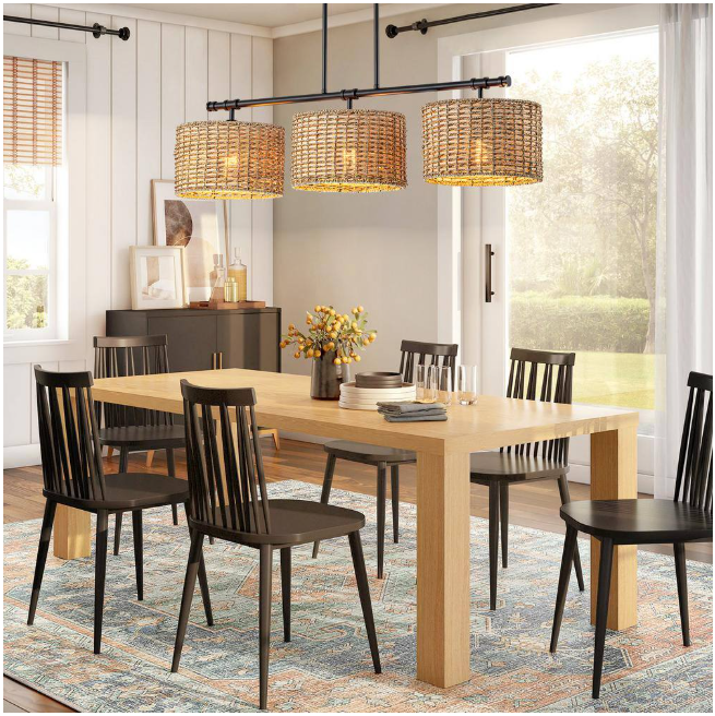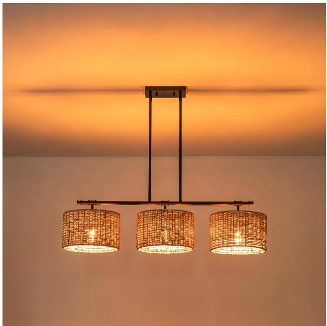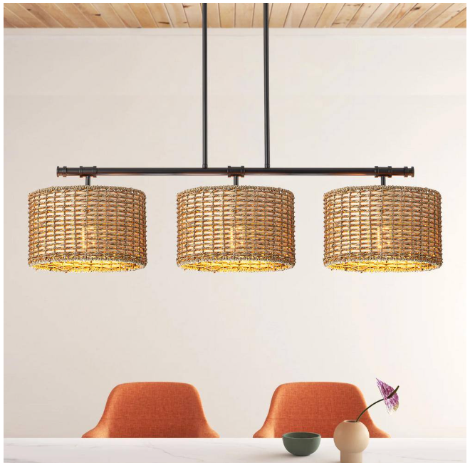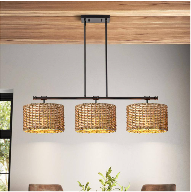 Illuminate your space with the Farmhouse Style Linear Island Chandelier Light, featuring matte black hardware and hand-woven natural rattan drum shades. This unique pendant light creates a warm and inviting atmosphere with its beautiful 360° shadows and charming Bohemian vibes, making it a perfect addition to kitchens, dining areas, and cafe bars. Combining rustic charm with modern functionality, this chandelier light is designed to be the focal point of your home, offering both warmth and beauty.