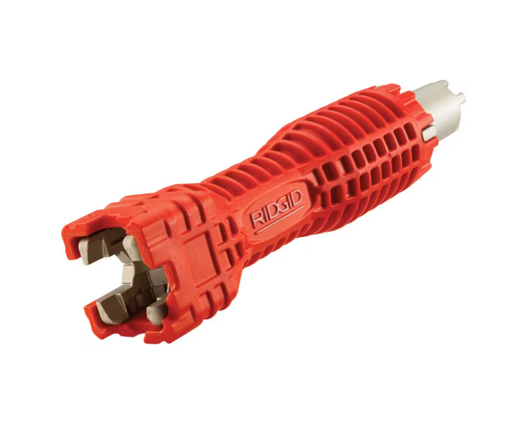 Whether you're a professional plumber or a working homeowner, the RIDGID EZ Change Plumbing Wrench Faucet Installation and Removal Tool is a valuable addition to any toolbox. This multifunctional plumbing tool is ideal for under-sink faucet installation and removal and is compatible with common faucets, shut-off valves, supply lines, and basket strainers. The six-sided cubed wrench insert works on 5/8-inch, 3/4-inch, 7/8-inch, 15/16-inch, and 1-inch nuts and is ideal for use with supply lines, clamp nuts, and turning angle stops without marring chrome finishes. The cylindrical insert with a 5/8-inch deep-welled socket end accommodates most single-hole faucet mountings and features a pronged retainer end that holds 3 or 4-slot strainer baskets in place while removing or installing the strainer nut. Additionally, the hole on the side of the cylindrical insert fits screwdrivers for extra leverage when breaking tight nuts loose. The wrench's notched end handle accommodates most common 2, 3, 4, and 6-tab basin mounting nuts, while the handle's open slot clears supply lines to loosen or attach. Its convenient handheld size clears tight spaces under sinks, while its reinforced plastic body and lightweight aluminum inserts that fit inside the handle provide long-lasting durability and use. RIDGID - Built For Those Who Know.