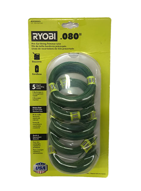 Leave the hassle of measuring and cutting trimmer line behind with the RYOBI Pre-Cut Trimmer Line. This trimmer line is premeasured and precut for quick and convenient reloads. The marked center indentation eliminates guess work resulting in faster and more accurate reloads. The durable 0.080 in. Heavy-Duty Spiral Co-Extruded Line is designed to fit all brands of bump-feed heads.