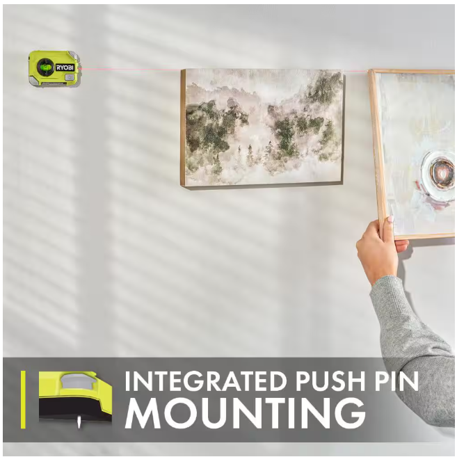 The RYOBI 15' Compact Laser Level is a convenient, easy to use laser level that fits right in your pocket, tool bag or drawer for quick access. This red laser level has a 15' range and (2) integrated push pins for wall mounting and hands-free leveling. Finally, the rotating bubble vial makes it easy to get an accurate read when leveling horizontally and vertically. This Laser Level includes the 15' Compact Laser Level, (2) AAA Batteries and Operator's Manual.