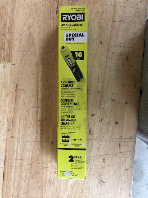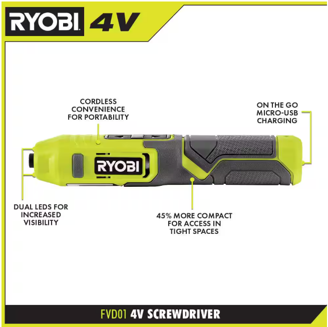 RYOBI introduces the 4V Screwdriver. This tool is 45% more compact for greater access in tight spaces when compared to the previous model. The cordless convenience allows portability during every application. Included are a USB charging cable and 2 screw driving bits. This 4V Screwdriver is backed by the RYOBI 2-Year Manufacturer's Warranty and includes FVD01 Screwdriver, USB Charging Cable, (2) Screwdriver Bit Sets, and Operator's Manual.