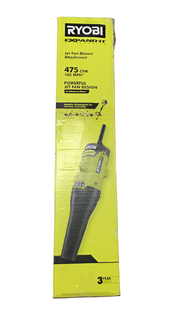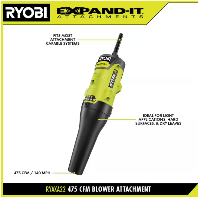 The RYOBI EXPAND-IT 475 CFM Blower Attachment is part of the RYOBI EXPAND-IT Attachment System. Easily transform your attachment capable string trimmer into a blower saving money, time, and space. This blower achieves 475 CFM & 140 MPH making it ideal for tackling light applications such as hard surfaces and dry leaves. The RYOBI EXPAND-IT 475 CFM Blower Attachment is compatible with most gas & cordless attachment capable systems. It's backed by the RYOBI 3-Year Manufacturer's Warranty and includes RYAXA22 Blower Attachment, Hanger Cap, and Operator's Manual.