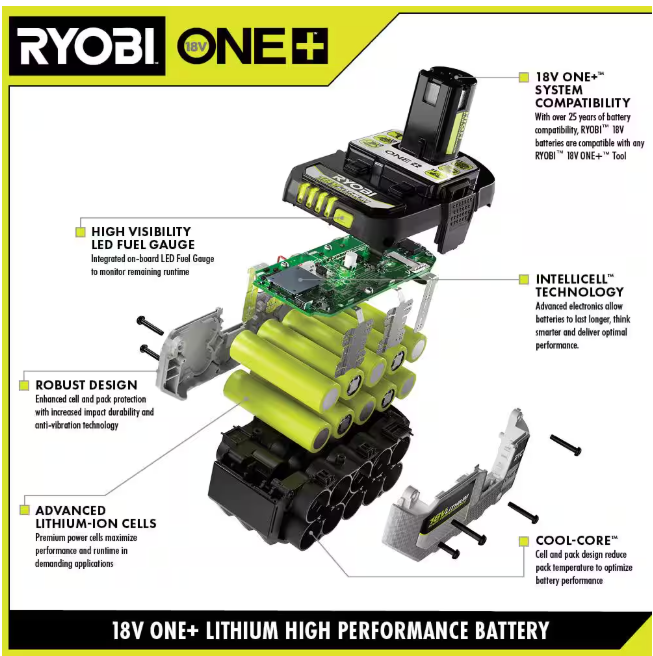 Enter the RYOBI 18V ONE+ System with the 18V ONE+ 6.0 Ah Lithium-Ion HIGH PERFORMANCE Battery. This 6.0 Ah battery features up to 6X more runtime than the previous model increasing overall efficiency. INTELLICELL battery technology features advanced electronics allowing batteries to last longer, think smarter and deliver up to 30% more power. The COOL-CORE design reduces temperature to optimize battery performance and extend battery life. Advanced lithium-ion cells maximize performance and runtime during demanding applications. The robust design and anti-vibration technology increases durability and enhances user experience. This battery features a high visibility LED fuel gauge to clearly indicate remaining runtime. Easily install and remove the battery with secure quick-release latches. Pair this Lithium-ion HIGH PERFORMANCE battery with any 18V ONE+ HP tool to leverage high performance brushless motors and advanced electronics for more power, longer runtime and the overall best experience on the 18V ONE+ system. Best of all, they are a part of the RYOBI 18V ONE+ System of over 300 Cordless Products that all work on the same battery platform. This 18V ONE+ 6.0 Ah Lithium-Ion HIGH PERFORMANCE Battery includes (1) PBP007 18V ONE+ 6.0 Ah Lithium-Ion HIGH PERFORMANCE Battery and Operator’s Manual. Charger sold separately.