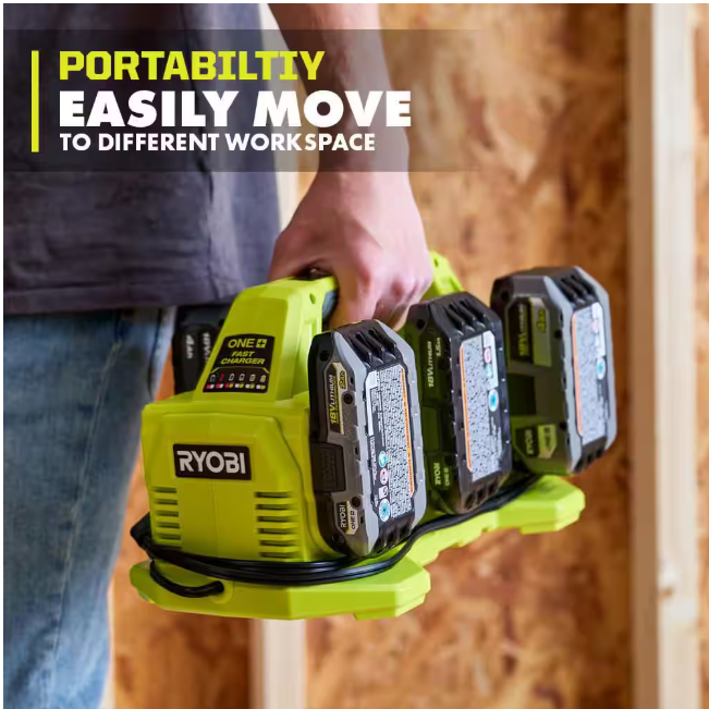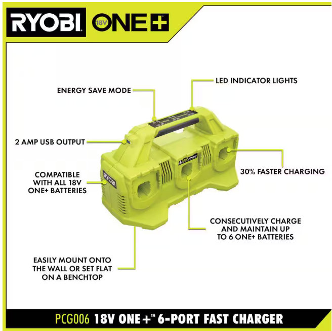 Expand your RYOBI 18V ONE+ System with the RYOBI 18V ONE+ 6-Port Fast Charger. With 30% faster charging than P135, this charger decreases downtime significantly. Made with convenience in mind, it can consecutively charge and maintain up to 6 18V ONE+ batteries. This charger includes a 2 Amp USB output allowing users to charge portable electronics. Featuring LED indicator lights, users can easily identify battery charge status. The Energy Save Mode conserves energy when not charging or maintaining batteries. To maximize workspace, the wall mount capability ensures organization at any given point. Best of all, it is part of the RYOBI 18V ONE+ System of over 300 Cordless Products that all work on the same battery platform. This 18V ONE+ 6-Port Fast Charger includes (1) PCG006 18V ONE+ 6-Port Fast Charger and Operator's Manual. Battery sold separately.