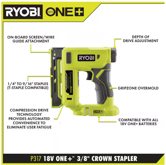 - Includes: (1) P317 18V ONE+ Cordless Compression Drive 3/8 in. Crown Stapler, (1) dual screen/wire attachment