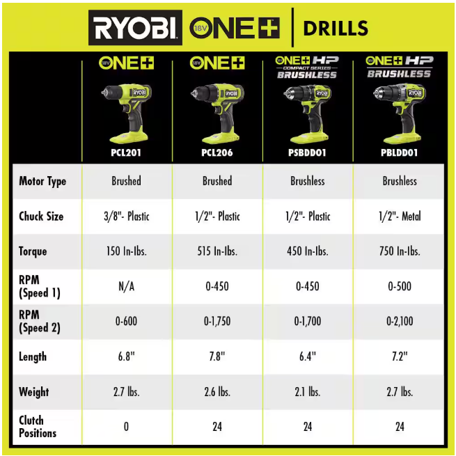 Expand your RYOBI 18V ONE+ System with the 18V ONE+ Cordless 1/2 in. Drill/Driver. The 18V ONE+ Cordless 1/2 in. Drill/Driver comes equipped with a powerful motor that provides 515 in./lbs. of torque. The 2-speed gearbox and 24-position clutch allow you to adjust the torque output to control the depth of the screw or fastener. The 1/2 in. keyless ratcheting clutch delivers secure bit retention for all your drilling and driving needs. The on-board LED worklight creates additional visibility for all of your projects. Best of all, it is part of the RYOBI 18V ONE+ System of over 300 Cordless Products that all work on the same battery platform. This 18V ONE+ 1/2 in. Drill/Driver is backed by the RYOBI 3-Year Manufacturer's Warranty and includes (1) PCL206 18V ONE+ 1/2 in. Drill/Driver and Operator's Manual. Battery and charger sold separately.
