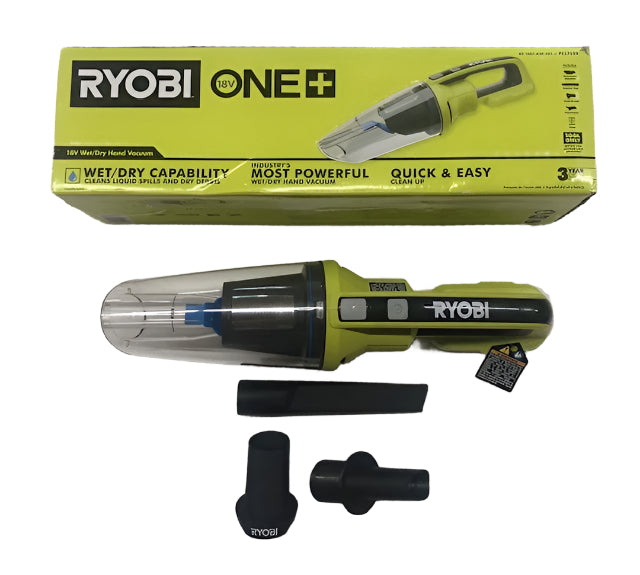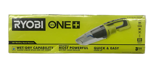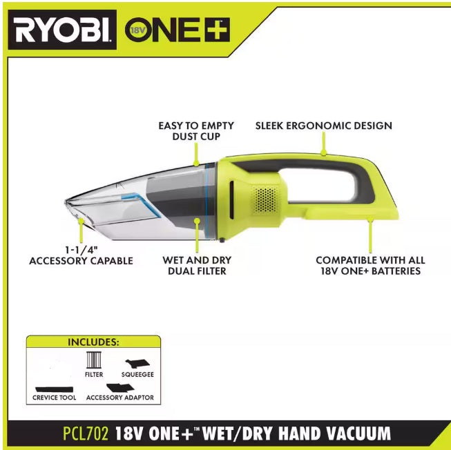 RYOBI introduces the 18V ONE+ Cordless Wet/Dry Hand Vacuum to our cleaning category. The industry's most powerful wet/dry hand vacuum quickly cleans liquid spills and dry debris. The handheld portability is perfect for cleaning on the go. The included accessories give users versatility in their cleaning applications. The crevice tool is ideal for cleaning in tight spaces while the squeegee is engineered to pick up liquid spills, leaving no mess behind. This wet/dry hand vac has an easy to empty dust cup and dual filter system that allows users to clean and maintain their vacuum for optimal performance Best of all, it's a part of the RYOBI ONE+ System of over 300 Cordless Products that all work on the same battery platform. This kit includes a 18V ONE+ Cordless Wet/Dry Hand Vacuum, Filter, 1-1/4 in. Accessory Adaptor, Crevice Tool, Squeegee, and Operator's Manuals. Battery and charger sold separately.
