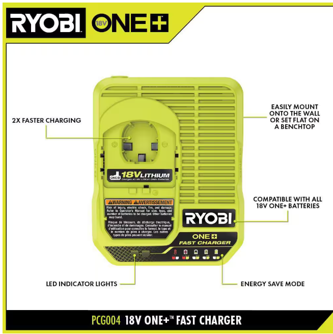 Expand your RYOBI 18V ONE+ System with the RYOBI 18V ONE+ Fast Charger. With 2X faster charging than PCG002, this charger decreases downtime significantly. Featuring LED indicator lights, users can easily identify battery charge status. The Energy Save Mode conserves energy when not charging or maintaining batteries. To maximize workspace, the wall mount capability ensures organization at any given point. Best of all, it is part of the RYOBI 18V ONE+ System of over 300 Cordless Products that all work on the same battery platform. This 18V ONE+ Fast Charger includes (1) PCG004 18V Fast Charger and Operator's Manual. Battery sold separately.