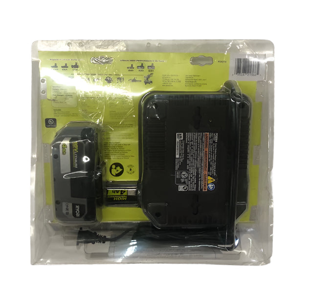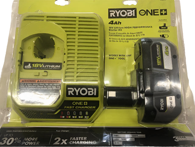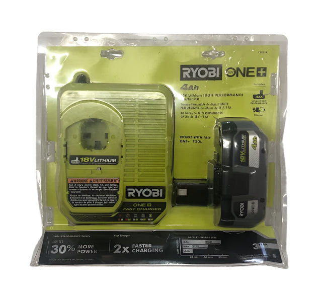 Expand your RYOBI 18V ONE+ System with the RYOBI 18V ONE+ 4.0 Ah Lithium HIGH PERFORMANCE Starter Kit. This 4.0 Ah battery features up to 4X more runtime than the previous model increasing overall efficiency. INTELLICELL battery technology features advanced electronics allowing batteries to last longer, think smarter and deliver up to 30% more power. The COOL-CORE design reduces temperature to optimize battery performance and extend battery life. Advanced lithium cells maximize performance and runtime during demanding applications. The robust design and anti-vibration technology increases durability and enhances user experience. This battery features a high visibility LED fuel gauge to clearly indicate remaining runtime. With 2X faster charging that its previous model, this charger decreases downtime significantly. Featuring LED indicator lights, users can easily identify battery charge status. The Energy Save Mode conserves energy when not charging or maintaining batteries.Best of all, it is part of the RYOBI ONE+ System of over 300 Cordless Products that all work on the same battery platform. This 18V ONE+ 4.0 Ah Lithium HIGH PERFORMANCE Starter Kit includes (1) PBP004 18V ONE+ 4.0 Ah Lithium HIGH PERFORMANCE Battery, (1) PCG004 18V ONE+ Fast Charger and Operator's Manuals.