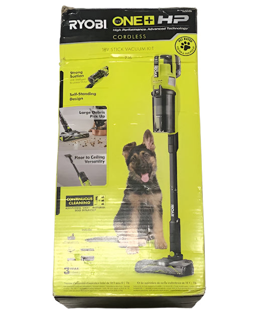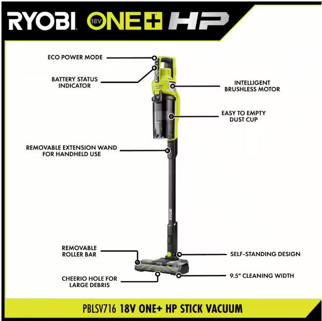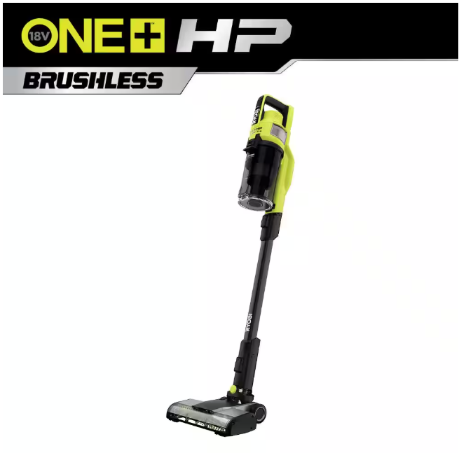 The RYOBI 18V ONE+ HP Stick Vacuum provides cordless convenience for floor-to-ceiling cleaning. ONE+ HP Technology delivers more power, runtime, durability and speed utilizing an intelligent brushless motor, advanced electronics and HIGH PERFORMANCE lithium technology for tackling dirt and pet hair. This stick vacuum stands on its own for ultimate user convenience. LED lights on the roller bar illuminate dust, dirt, and hair while the easy to empty dust cup and removable roller bar allow you to quickly maintain your vacuum. By removing the extension wand, you now have a hand vacuum for cleaning messes in cars, on stairs, on delicate surfaces, and in tight spaces with the included accessories. The crevice tool is perfect for cleaning in hard-to-reach areas while the dust brush is your go-to for delicate surfaces. Easily replace your filters and roller bars for uninterrupted performance. Best of all, it is part of the RYOBI ONE+ system where any 18V ONE+ battery works with any 18V ONE+ product. The 18V ONE+ HP Stick Vacuum includes a Crevice Tool, Dust Brush, Wall Mount, and Operator's Manual.