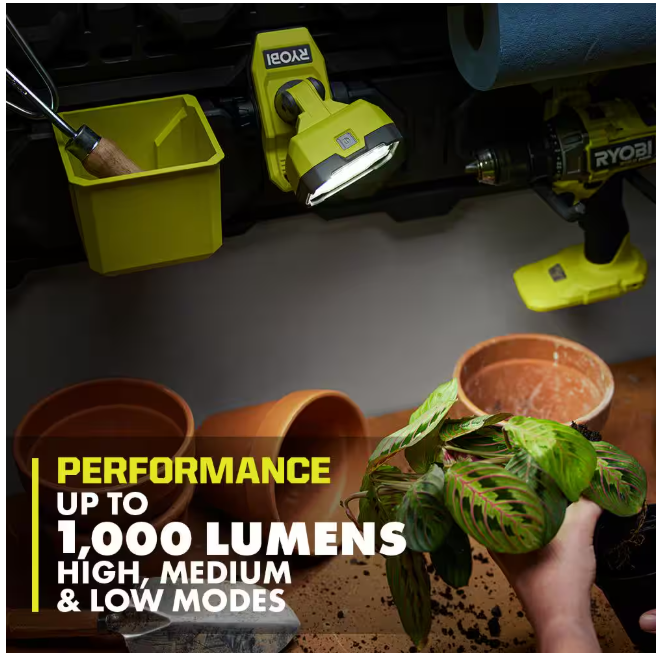 The RYOBI USB Lithium LED Magnetic Clamp Light Kit provides powerful illumination in a durable hands-free design. With up to 1,000 Lumens and 3 brightness modes, this light suits a variety of needs for any environment. Featuring a 360° rotating and 180° pivoting head, light up any workspace or environment with customizable lighting placement. Mount anywhere with 1-1/4" magnetic clamping base or with RYOBI LINK Wall Storage compatibility. Never be left in the dark when tackling time consuming tasks with 10 hours of runtime using the included USB Lithium 2Ah Battery on low. The IP54 dust and water resistance rating ensures this light is a reliable solution built to withstand even the toughest conditions. The included USB Lithium 2Ah battery features a USB-C port that also charges mobile devices, and a LED fuel gauge that clearly indicates the battery level status with the press of a button, eliminating guess work. The product also features an LED indicator to signal when the battery is charged (green) or has low battery (red) while in-use. Best of all, it is part of the RYOBI USB Lithium System of tools that provides compact, rechargeable, everyday solutions for cordless power and productivity.