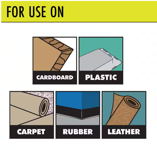 - Self sharpening blade powers through a variety of materials including cardboard, plastic, carpet, rubber, and leather