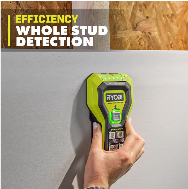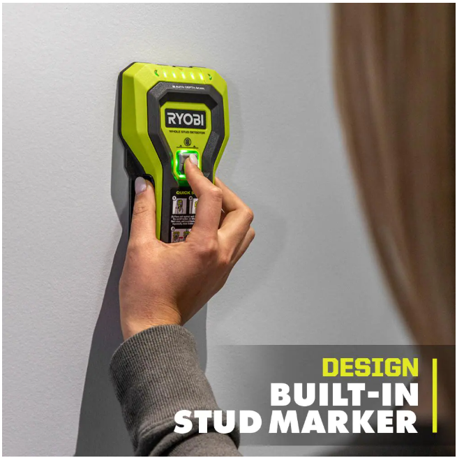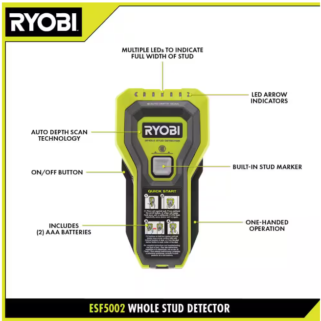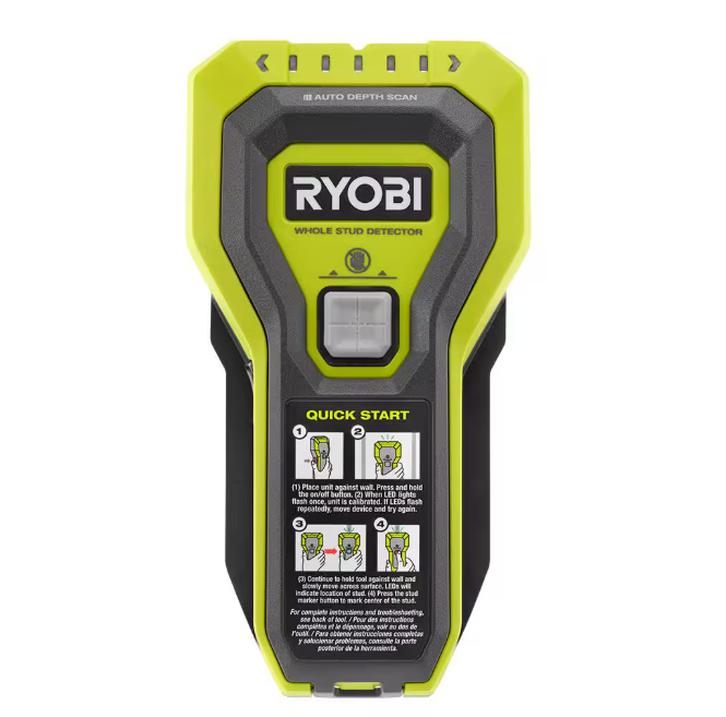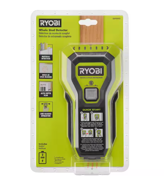 The RYOBI Whole Stud Detector is designed with multiple LED's to indicate the full width of the stud, not just an edge or center. The one-handed operation provides an easy to use experience every time. The Auto Depth Scan Technology determines the thickness of the wall up to 1-1/2 in. thick to accurately identify wood and metal studs. The built-in stud marker conveniently marks the center of the stud without the need for a pencil. Included is (1) Whole Stud Detector, (2) AAA Batteries and Operator's Manual.