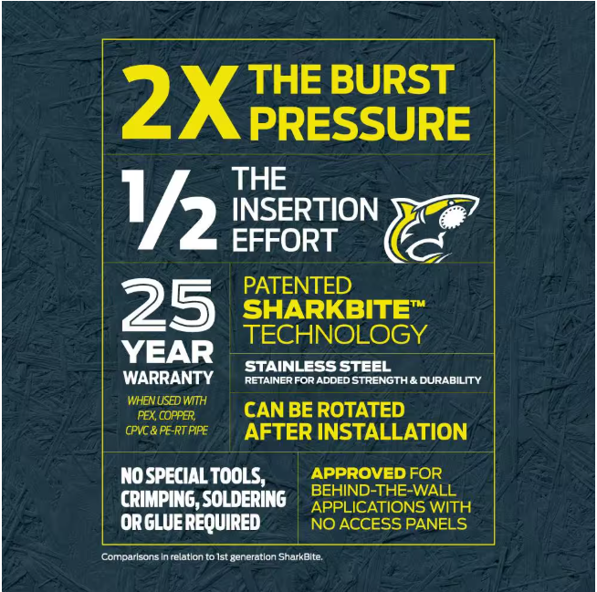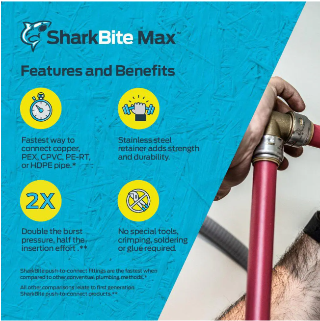SharkBite Max push-to-connect ball valves are the fastest and easiest way to install a new or replacement water shut-off valve. A newly designed stainless steel collet retainer delivers additional strength and durability and provides a 250 psi pressure rating. SharkBite Max fittings and valves don't require a PEX tube liner and a re-engineered body allows you to insert the pipe using less force and greater ease. The single lever quarter turn handle allows for quick control over water flow, especially in tight spaces. No soldering, clamps, unions, glue or special tools required. After inserting the pipe, stainless steel teeth bite down and grip the pipe tightly while a specially formulated O-ring compresses around the pipe to create a watertight seal. The valve can be rotated after installation for quick adjustments and removing the valve is just as fast with a disconnect tool, allowing them to be changed or reused.